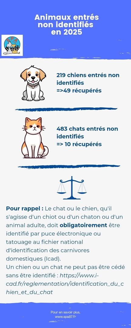 Il y a encore trop d’animaux non identifiés qui perdent ainsi une chance de retrouver leur propriétaire, trop de maltraitance, trop d’abandons dont certains non justifiés.